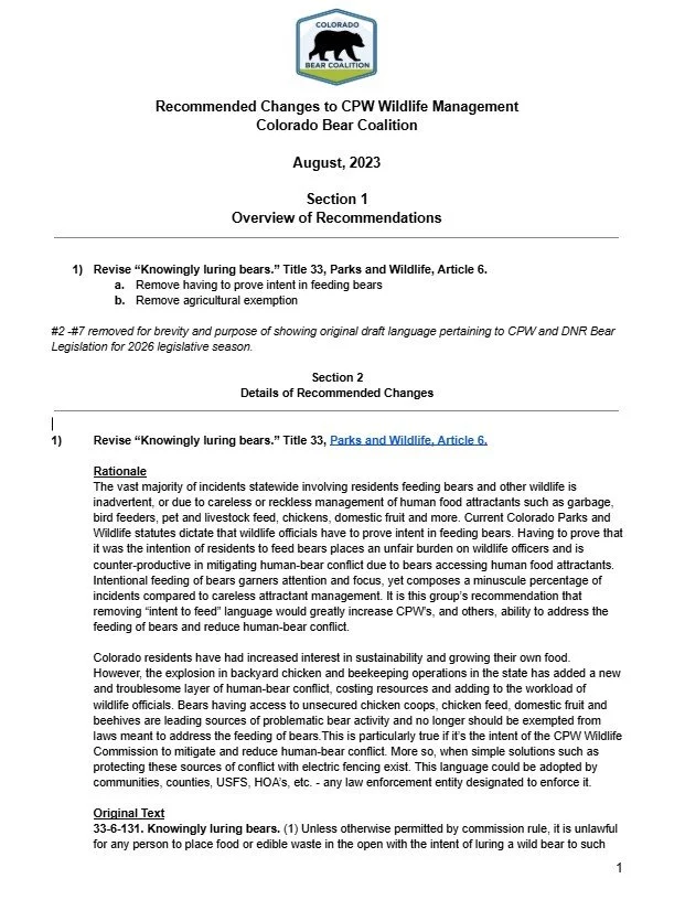 The following is the original (abbreviated) list of 7 recommendations that CBC provided to Governor Polis’ Senior Policy Advisor for Wildlife, Agriculture, and Rural Economic and CPW Director Jeff Davis August 2023 and October 2023 respectively.