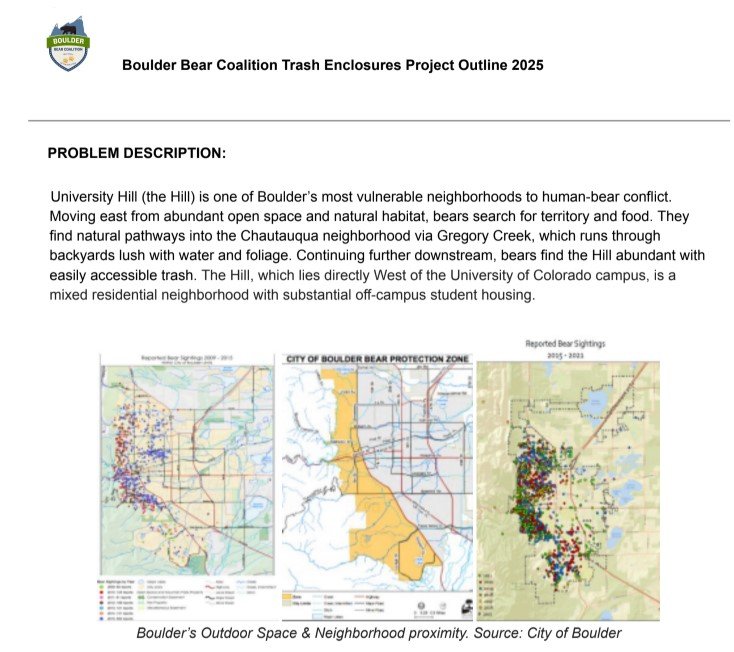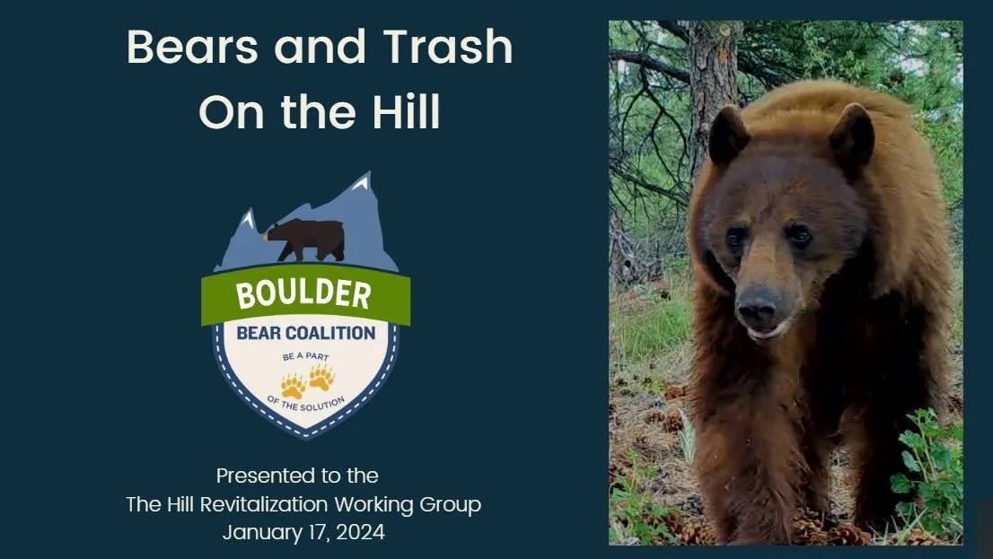 The Colorado Bear Coalition works with Boulder Bear Coalition, a local nonprofit, to build enclosures on The Hill, a notoriously high human-bear conflict area in Boulder. Learn about their groundbreaking efforts to reduce the #1 reason that bears are in town -unsecured trash!